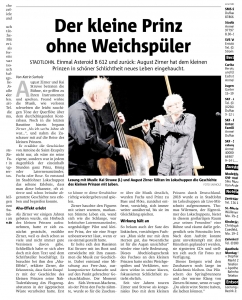»Der Klassiker von Antoine de Saint-Exupéry ist ein Plädoyer für Freundschaft und Menschlichkeit. Träumerisch und melancholisch, poetische, humorvoll, unverstellt und ergreifend. Mit warmer Stimme entführt Zirner, der das Märchen auch für ein Hörbuch aufgenommen hat, in die bezaubernde Welt des kleinen Prinzen […] Musikstück zwischen den Passagen unterstreichen die Worte, greifen die Stimmung des Textes auf und verstärken sie, ziehen die Zuschauer in das Märchen hinein, bringen das Erzählte schwebend und gefühlvoll zum Klingen, lassen es in den Zuhörern nachwirken. Komponiert hat Zirner die poetische Musik zum Märchen gemeinsam mit Kai Struwe, Mitglied des Spardosen-Terzetts, mit dem Zirner schon seit Jahren zusammenarbeitet. Mit Leidenschaft bringt der 59-Jährige sein Instrument zum Sprechen und Swingen. Biegt sich, wiegt sich, windet sich, geht in Dialog mit seinem Bühnenpartner.«