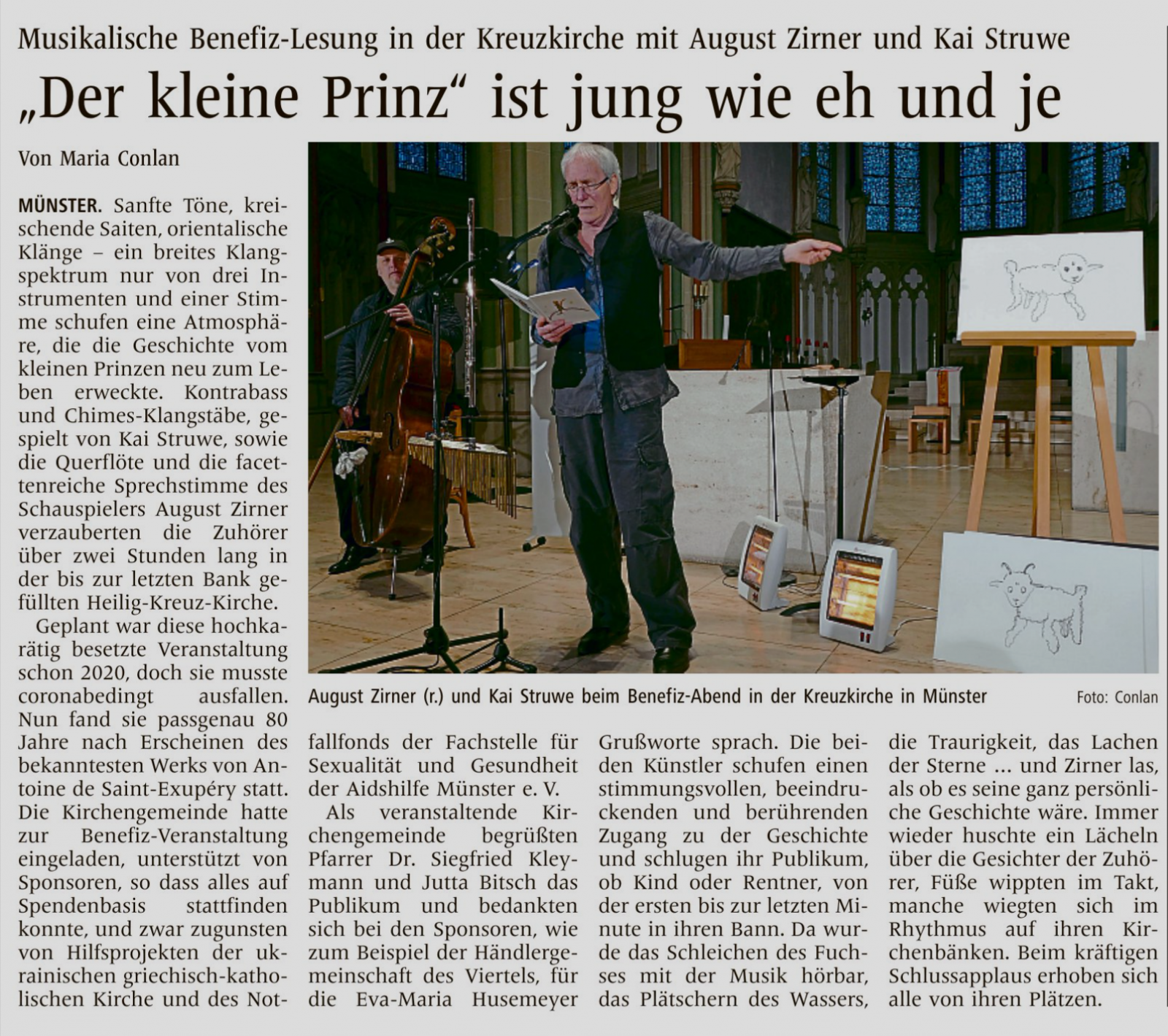 Antoine de Saint-Exupéry schreibt in “Wind, Sand und Sterne”: “Die Größe eines Berufes besteht vielleicht vor allem darin, dass er Menschen zusammenbringt. Es gibt nur eine wahre Freude: den Umgang mit Menschen.” Auch in diesem Sinne haben August Zirner und Kai Struwe mit ihrem Beruf und ihrer Kunst zur Freude des Publikums beigetragen, nicht zu vergessen die konzentriert lauschenden “kleinen Leute”, die mit ihren Eltern gekommen waren.